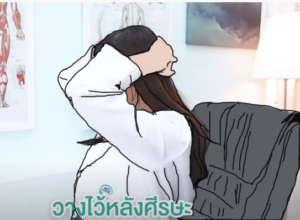 ท่าที่1: ท่ายึดคอ มือข้างหนึ่งจับทีเก้าอี้ วางมืออีกข้างที่ข้างใบหู หรือขมับ ออกแรงดึง นับค้างไว้ 10-15 วินาที จากนั้นสลับข้าง