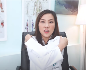 ท่าที่4: ยืดไหล่ด้านนอก กางแขนทั้งสองข้าง ค่อยๆโอบเข้ามาจับที่หัวไหล่ แขนขวาอยู่ด้านล่าง แขนซ้ายอยู่ด้านบน ค่อยๆเอามือขอศอกตั้งชิดกัน หลังมือทั้งสองข้างชิดกัน หลังจากนั้นล็อคข้อมือเข้าหากัน บิดกันโดยให้นิ้วโป้งอยู่ที่หน้า จากนั้นออกแรงดึงขึ้นไปตรงๆ ค่อยๆ ดึงช้าๆ จะตึงที่หัวไหล่ หายใจสบายๆไม่ต้องกลั้นหายใจ เมื่อรู้สึกตึงเต็มที่ นับค้างไว้ 10-15 วินาที จากนั้นสลับข้าง