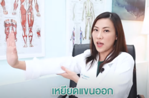 เหยียดแขนออกไป ตั้งแขน 90 องศา จากนั้นใช้มืออีกข้างดันที่บริเวณปลายฝ่ามือเบาๆ กระดกข้อมือขึ้น นับค้างไว้ 10-15 วินาที จากนั้นสลับข้าง