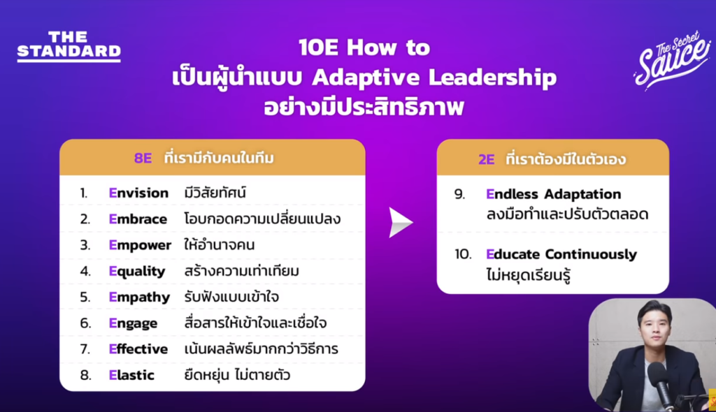 - รับฟังเสียงคนตัวเล็กๆ ให้ครอบคลุม เป็นสิ่งที่พลิกความสำคัญในการเป็นผู้นำ ต้องให้ความสำคัญในทุกเสียง ไม่ว่าตำแหน่งนั้นอาจไม่มีผลต่อการเปลี่ยนแปลง แต่ผู้นำในยุคนี้ต้องทำคือรับฟังทุกเสียงที่สะท้อนเข้ามาให้ได้มากที่สุด เปิดกว้างรับความหลากหลาย ระดมทุกความคิดเห็น เพราะหลายครั้งคนที่อยู่หน้างาน หรืออยู่ในระดับต่ำที่สุดอาจเข้าใจปัญหามากที่สุดเช่นกัน