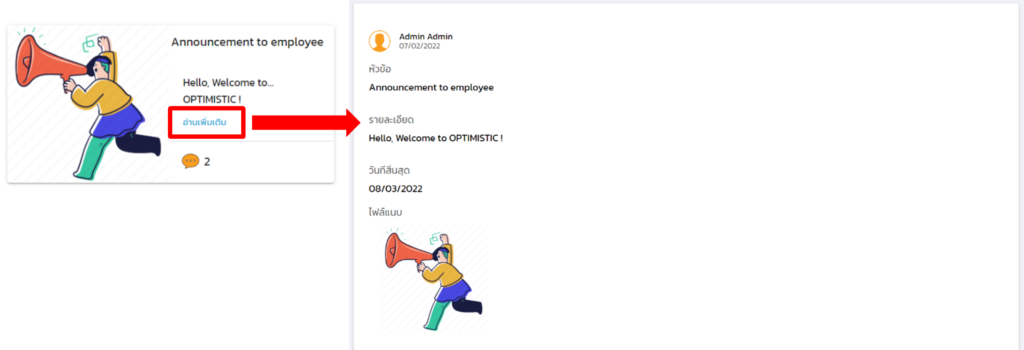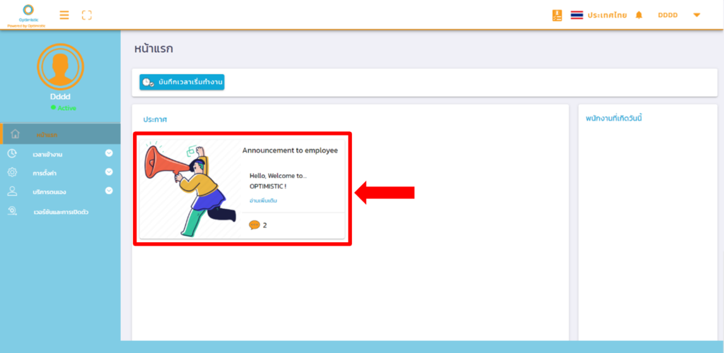 1. สามารถดูข้อมูลประกาศจาก HR หรือ Admin ได้ที่หน้าแรก