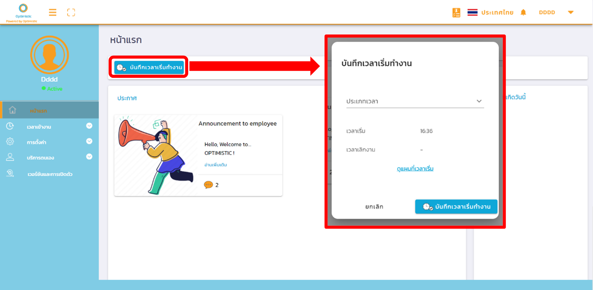 1. สามารถลงเวลาเข้างานได้ที่หน้าแรก โดยกดที่ปุ่มบันทึกเวลาเริ่มทำงาน