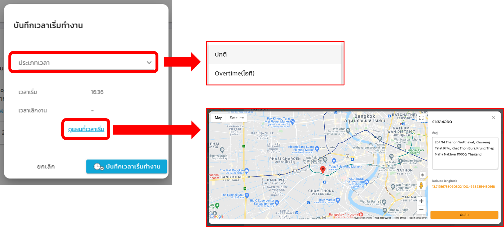 2. ในหน้าต่างบันทึกเวลาเริ่มทำงาน ให้เลือกประเภทของเวลาเข้างาน เลือกตำแหน่งที่ทำการบันทึกเวลาเข้างาน และกดบันทึกเวลาเริ่มทำงาน