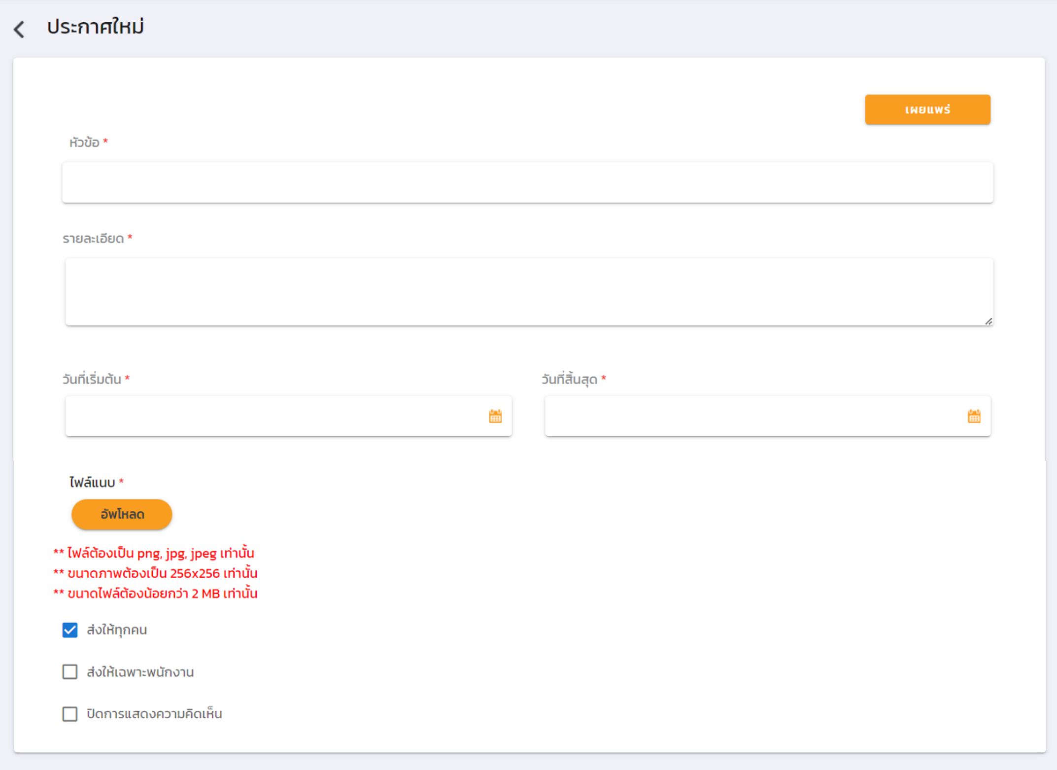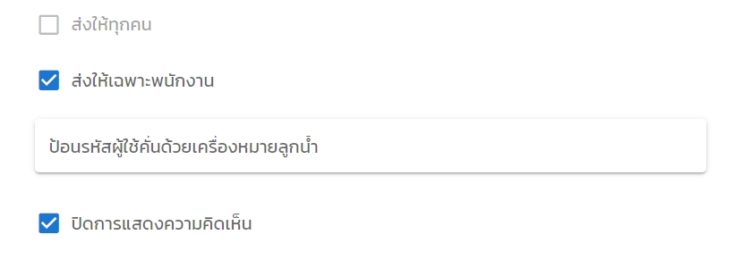* สามารถเลือกให้แสดงประกาศกับพนักงานทุกคน หรือเฉพาะคนได้ (กำหนดโดยรหัสพนักงาน) และเลือกให้มีหรือไม่มีการแสดงความเห็นจากพนักงานได้