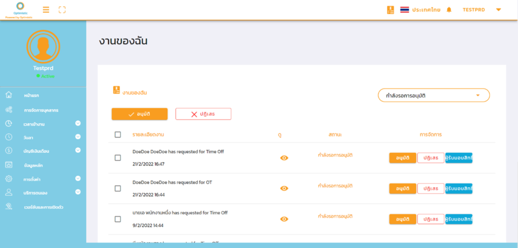 2. สามารถทำการอนุมัติคำขอ ปฏิเสธคำขอ หรือมอบหมายสิทธิ์ในการอนุมัติให้กับพนักงานคนอื่นได้ในเมนู งานของฉัน (My Task)