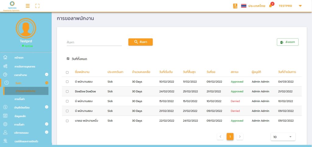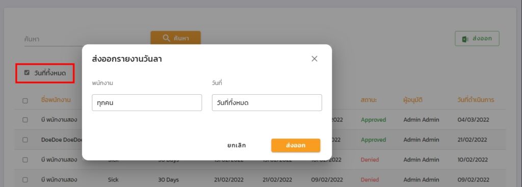 สามารถดูข้อมูลคำขอลาหยุดของพนักงานที่มีการอนุมัติ หรือปฏิเสธแล้ว โดยสามารถดาวน์โหลดออกมาเป็นไฟล์ excel ได้