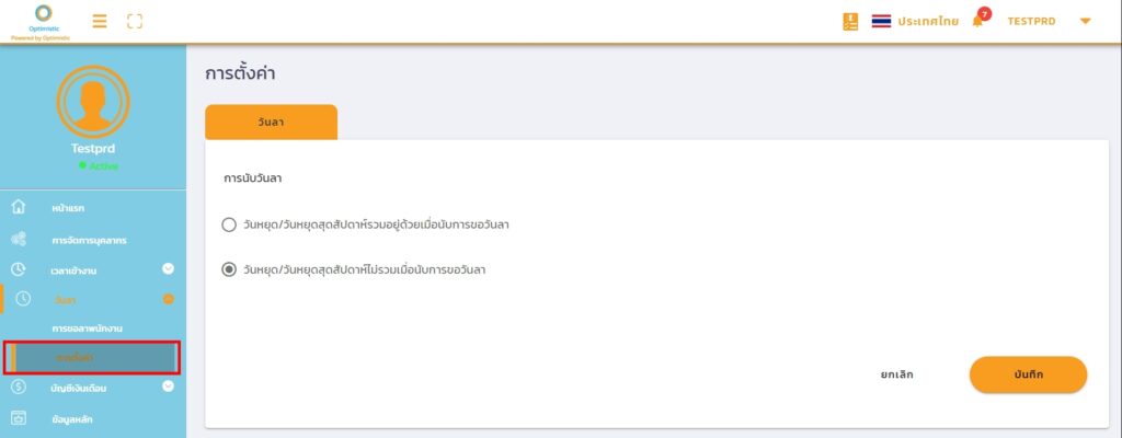 ตั้งค่าการนับจำนวนวันลาได้ที่ ตั้งค่าในเมนูวันลา โดยสามารถเลือกได้ว่าจะนับรวมวันหยุดและวันหยุดสุดสัปดาห์ไปในการขอลาของพนักงานด้วยหรือไม่