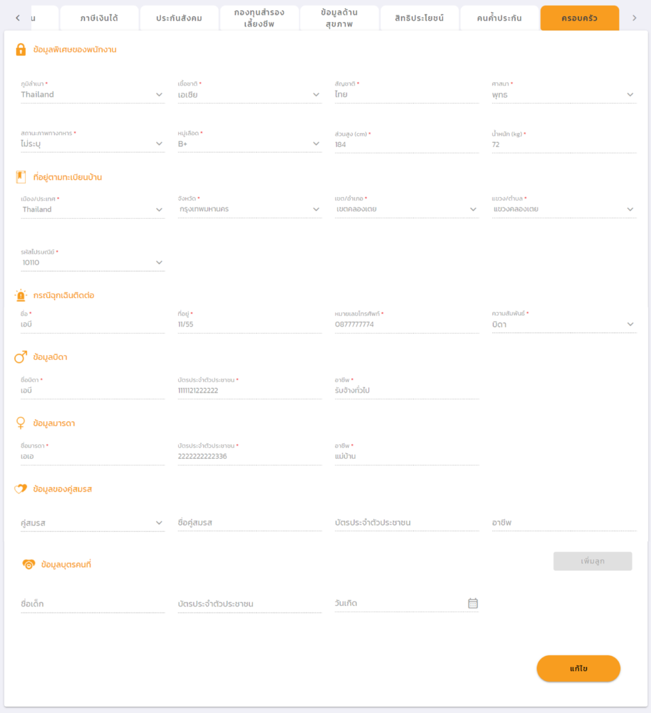 แสดงรายละเอียดครอบครัว บิดา มารดา คู่สมรส บุตร และผู้ติดต่อในกรณีฉุกเฉิน