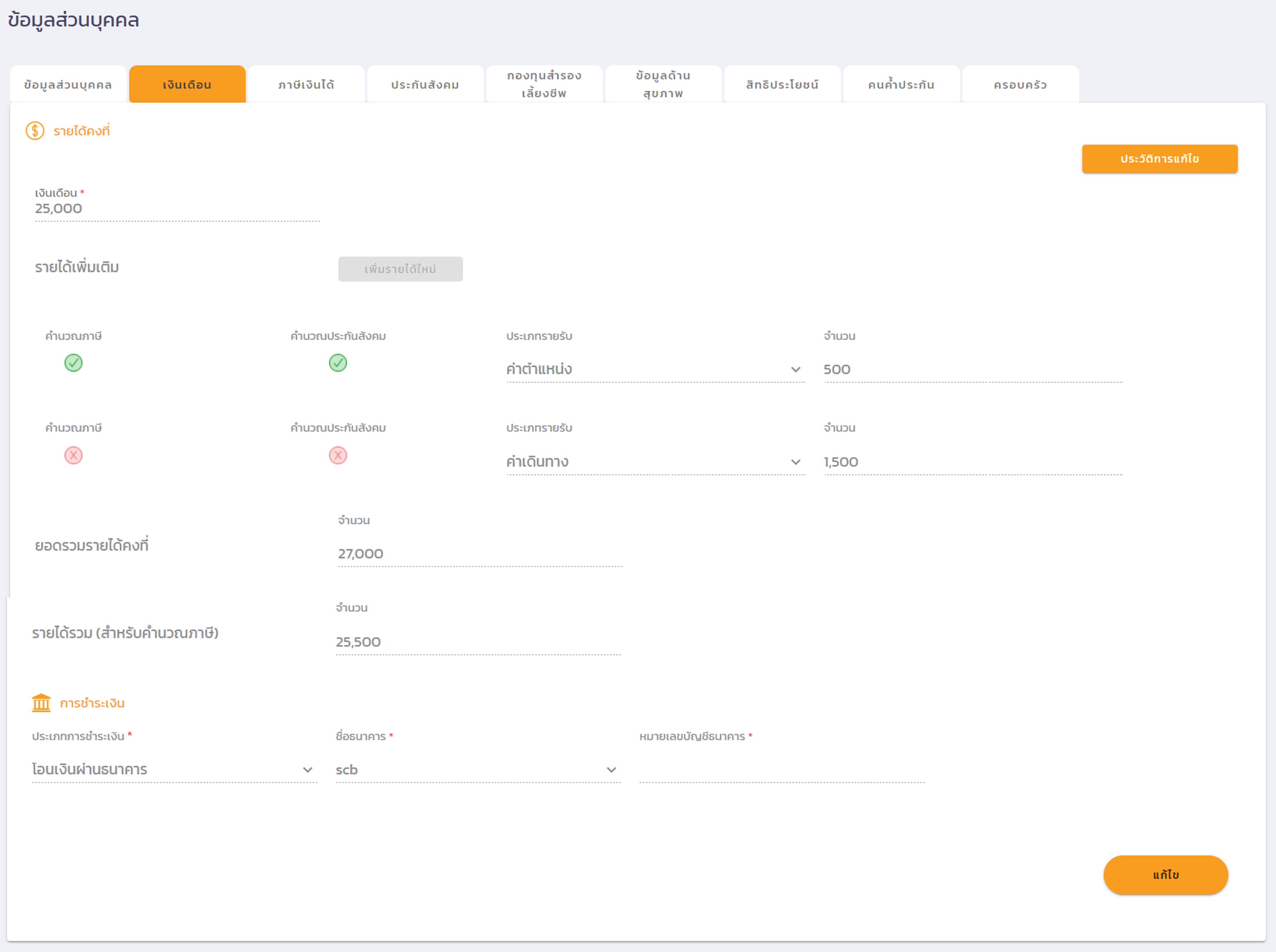 ข้อมูลเงินเดือนของพนักงาน สามารถระบุเงินเดือน หรือเพิ่มรายได้เพิ่มเติมของพนักงานได้ รวมถึงข้อมูลช่องทางการจ่ายเงินเดือนให้กับพนักงาน