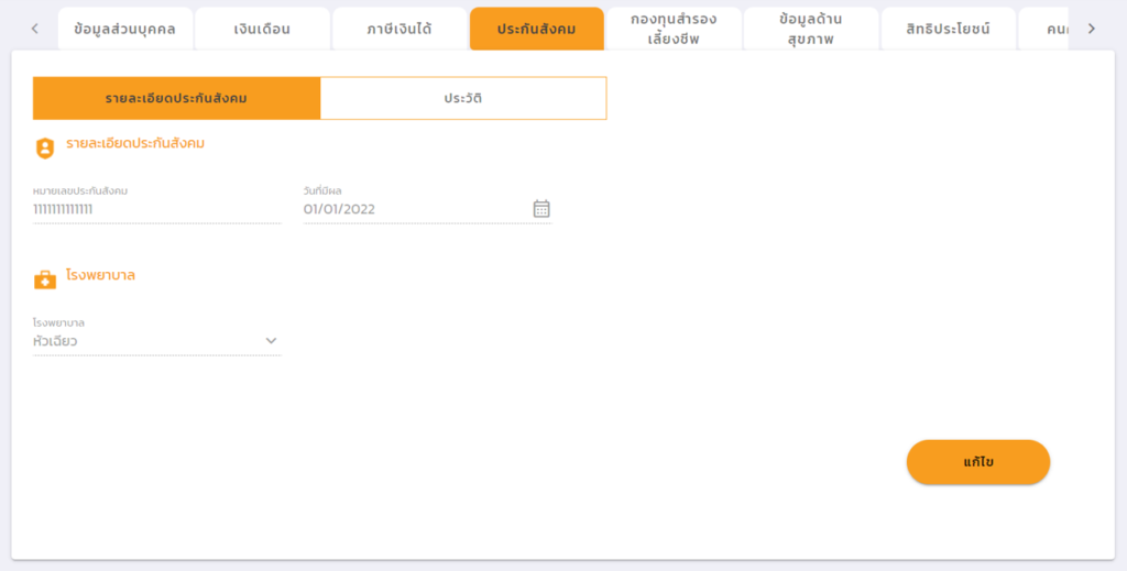 แสดงรายละเอียด หมายเลขประกันสังคม โรงพยาบาลประกันสังคม และประวัติการย้ายโรงพยาบาล