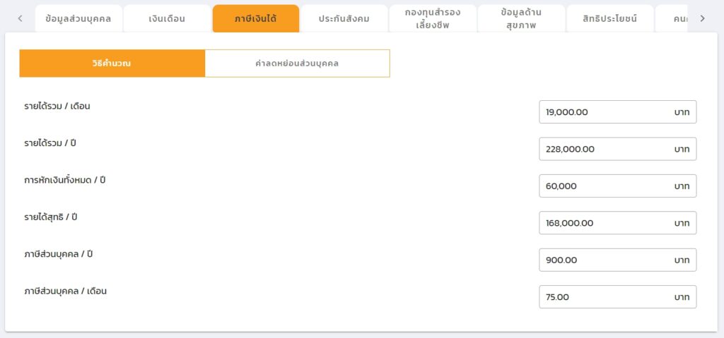 มีการแสดงวิธีคำนวณภาษีเงินได้ของพนักงาน โดยอัตราการคำนวณภาษีมาจากการตั้งค่าข้อมูลหลัก(Master Data) ในหัวข้อภาษีเงินได้
