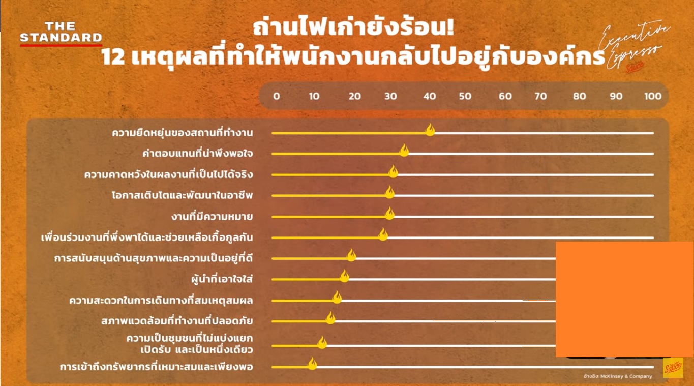 จะเห็นได้ว่าความแตกต่างจากเหตุผลที่ลาออกคือ 1-3 เหตุผลแรก คือเหตุผลให้คนอยากกลับมาทำงานมากสุด และจะเห็นว่า หัวหน้าคือเหตุผลที่คนอยากลาออกมาสุด แต่ไม่ใช่เหตุผลที่คนอยากกลับมาทำงานมากสุด ฉะนั้นหลักๆ คือ ความยึดหยุ่นของสถานที่ทำงาน ค่าตอบแทนที่น่าพึงพอใจ ความคาดหวังที่เป็นไปได้จริงและยั่งยืน จึงทำให้คนกลับมาทำงาน