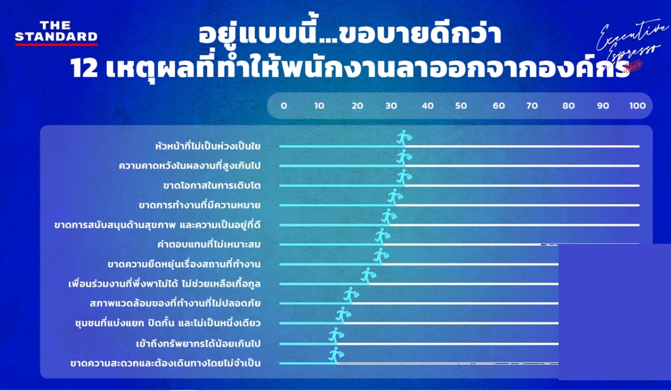 เพราะพวกเขาไม่พอใจ หลายคนที่ลาออกจากงานต่างเล่าถึงประสบการณ์ การทำงานกับหัวหน้าที่ไม่เป็นห่วงเป็นใย ความคาดหวังที่สูงมากจนไม่สามารถทำงานที่ยั่งยืนได้ รวมถึงการขาดความก้าวหน้าในอาชีพการงาน เป็นสาเหตุใหญ่ที่สุดในการลาออก