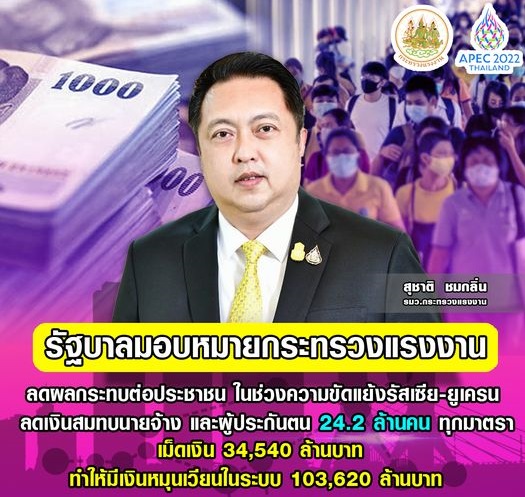 รมว.แรงงาน “สุชาติ ชมกลิ่น เผย “มาตรการลดค่าครองชีพประชาชน” เคาะลดเงินสมทบผู้ประกันตนในระบบประกันสังคมมาตรา33 39 40 และนายจ้าง นาน3เดือน กู้วิกฤติยูเครน-รัสเซีย